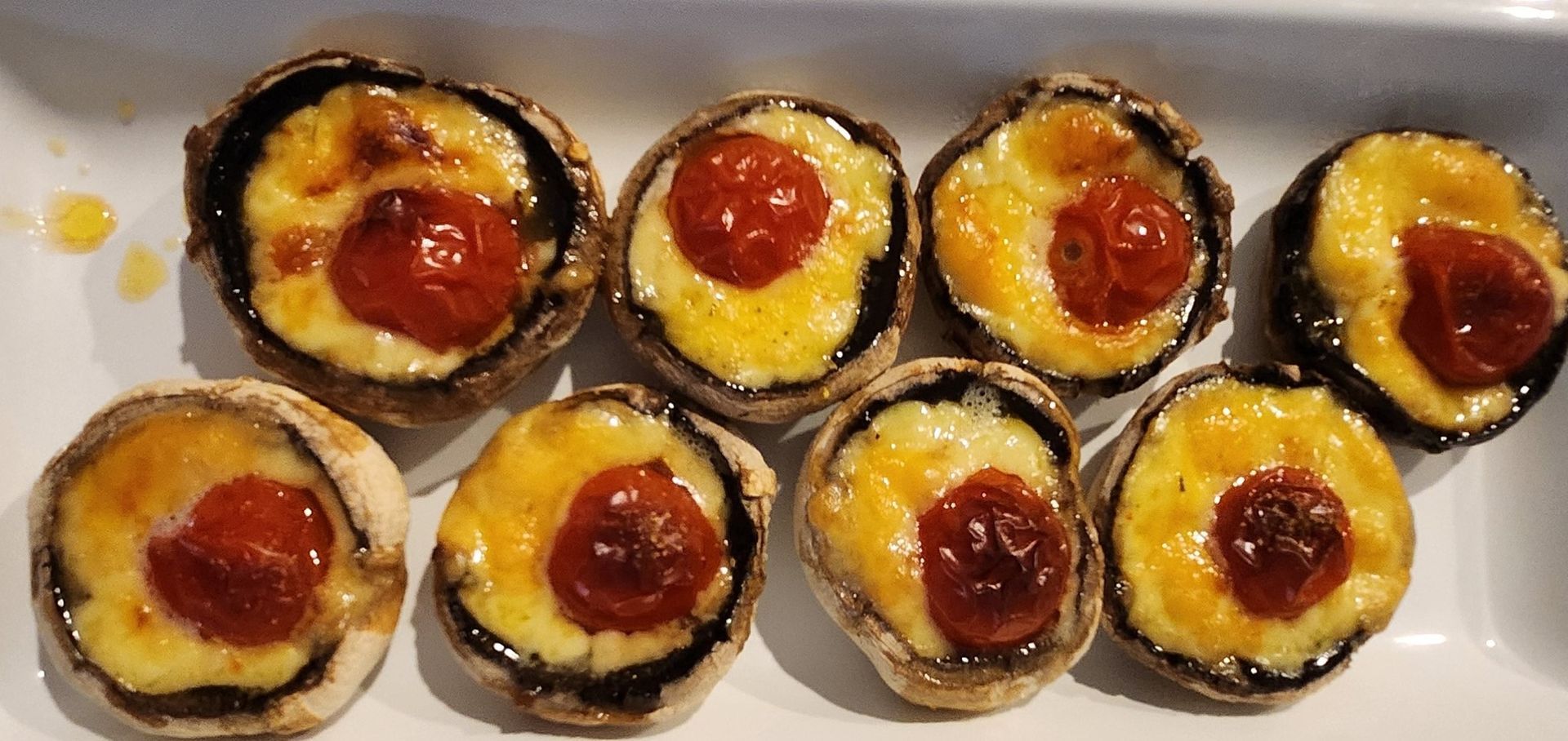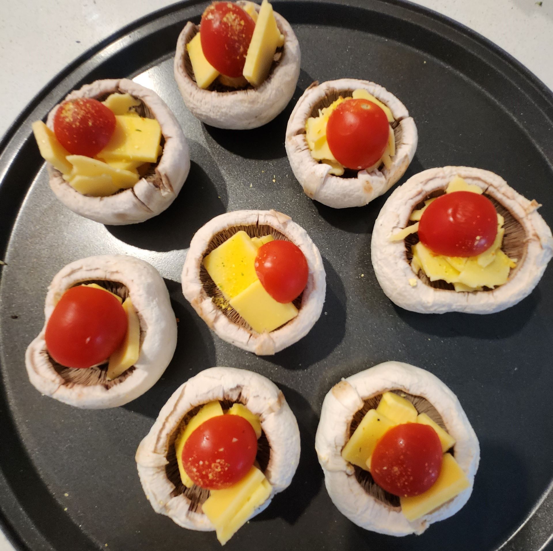 If you have the flat mushrooms (which are the same family as the button ones, only that they were grown longer and got … bigger) then cut the cheese and tomatoes in slices and make them as sandwich on the mushrooms.