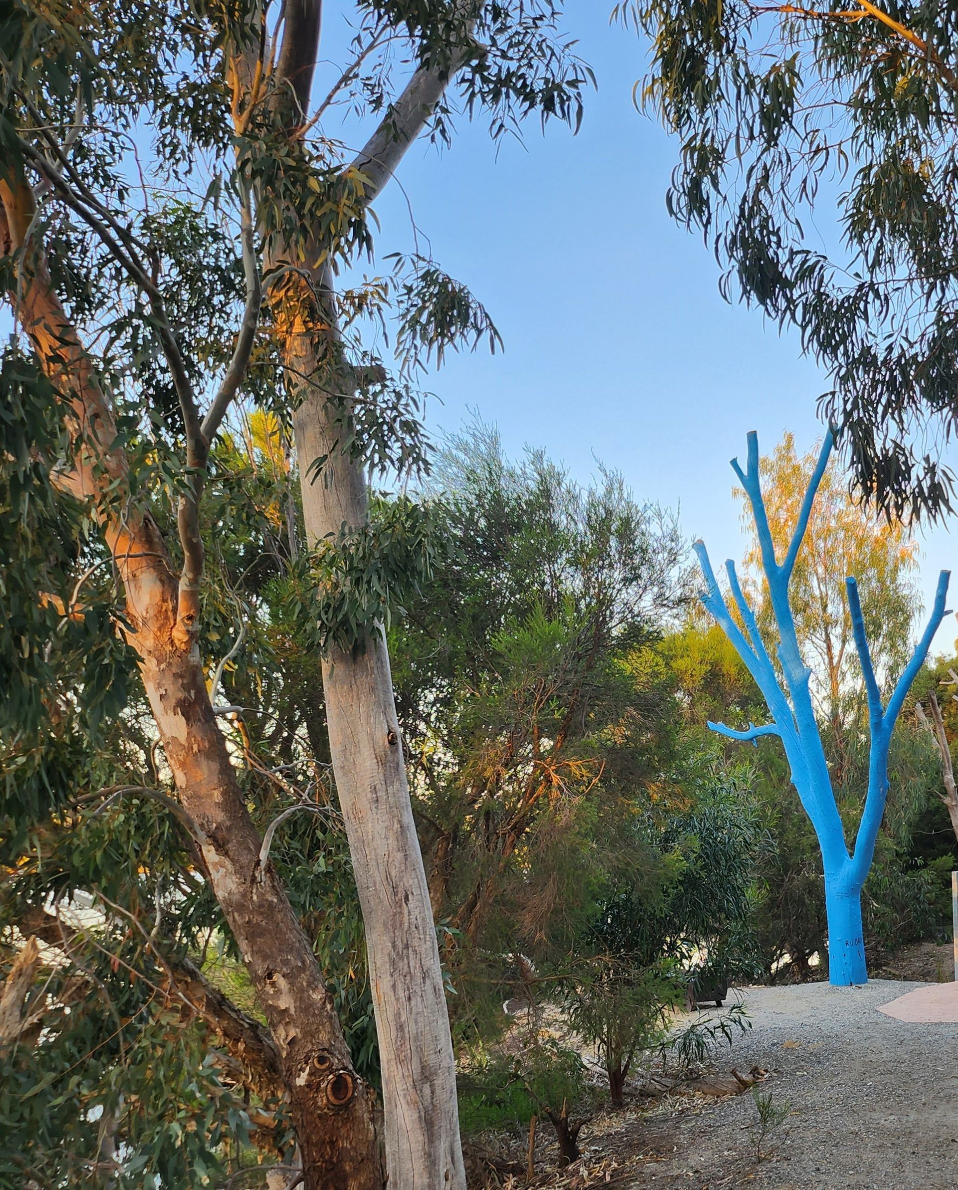 A dead tree trunk with its roots still sunk deep into the shore of the lake towered over the water. Somebody had taken time to paint the naked trunk a buoyant light blue. A carved wooden bench next to it invited walkers to sit and take in the lake with its surface coming to life and wait for the houses across the lake to appear out of the mist.’