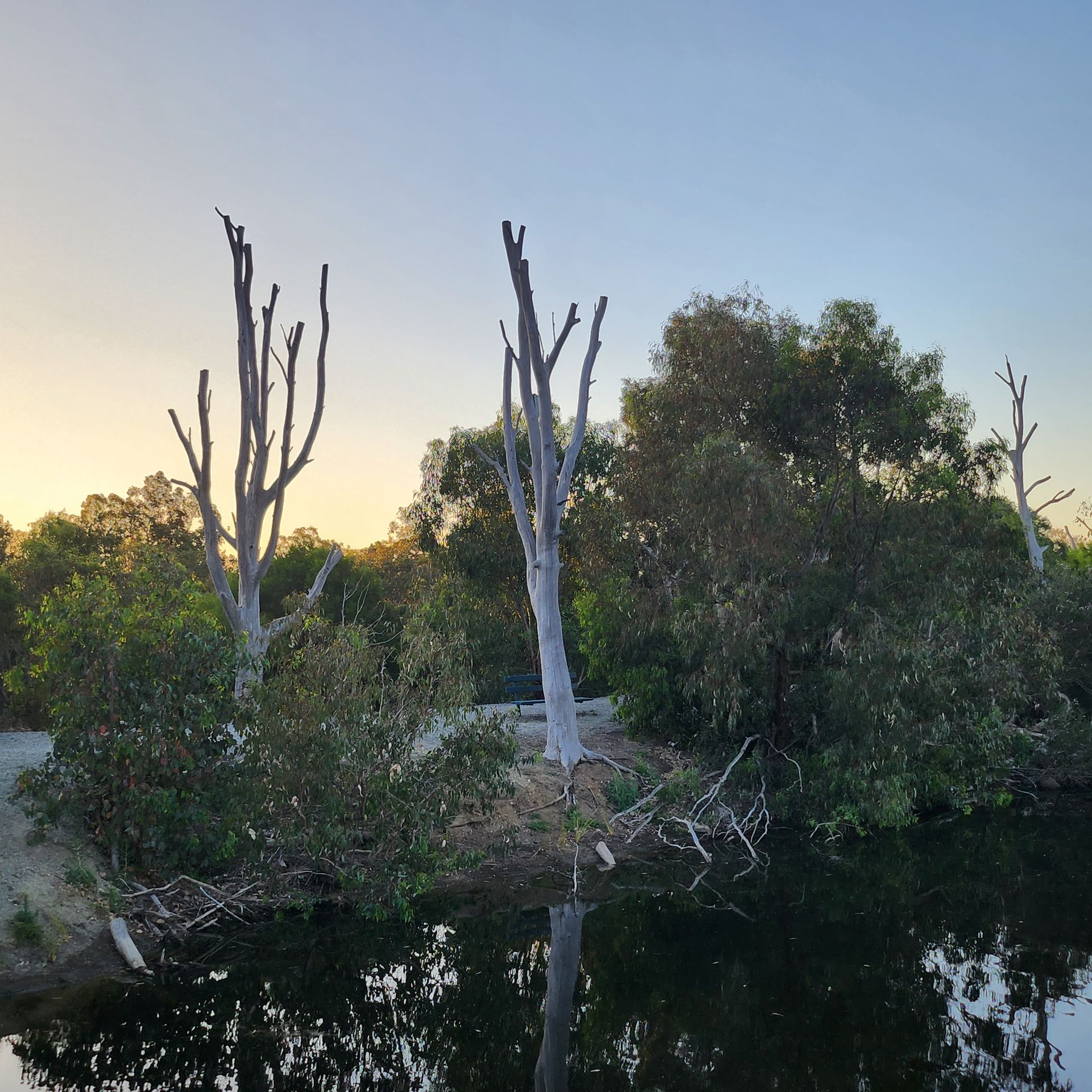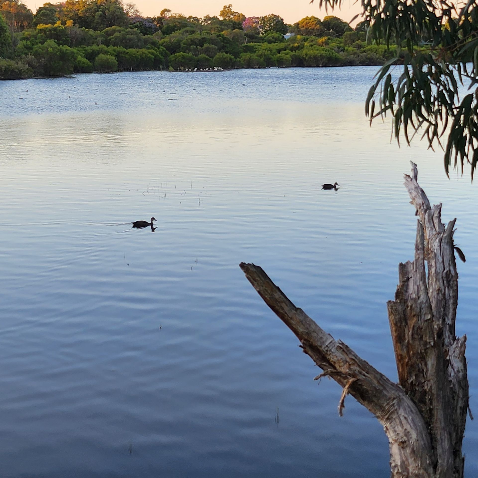 ‘The wind whispered over the tall greenery and must have scared a small creature, because something crawled away almost silently. Ducks flew in circles around a bush, annoyed by the crawling thing. The ducks landed near the path and slid through the same gap, following the crawler. They all disappeared, hidden by the banksias.